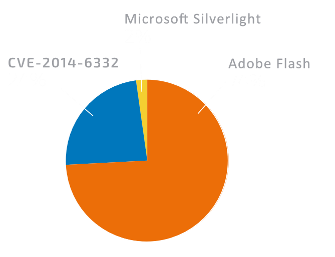 予想どおり、Angler が配信するエクスプロイトの圧倒的多数が Adobe Flash を利用するもので、ユーザに配信されたエクスプロイトの 75 % 近くが Adobe Flash に関連していました。このことは、調査を行った月に Angler により利用された 2 つの Adobe Flash ゼロデイ脆弱性(CVE-2015-5119popup_iconCVE-2015-5122popup_icon)から予想されたとおりの結果です。その他の 2 つのエクスプロイト グループは、多少予想外のものでした。2 番目に大きいグループは、Internet Explorer の脆弱性 CVE-2014-6332popup_icon を利用するもので、感染全体の 20 % 強を占めていました。残る 1 つのグループが最も予想外で、約 2 % のユーザが Silverlight の脆弱性による侵害を受けていました。以上のことからわかるとおり、Angler が利用しているエクスプロイトは、Flash、IE、および Silverlight の 3 つのグループに大きく分類されます。意外だったのが、これらのグループの中に Java が含まれていない点です。長年にわたり Angler および大多数のエクスプロイト キットが、Java をターゲットにしてきました。これは主として、非常に多くのユーザが今なお古く脆弱なバージョンの Java を使い続けているためです。