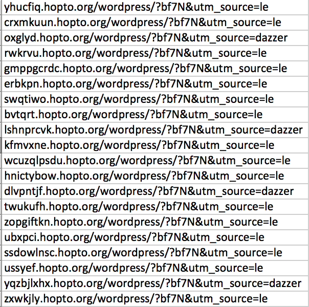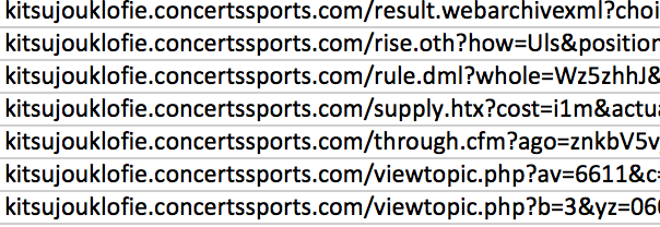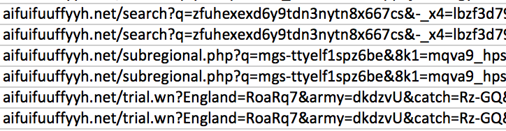 この基本構造では、クエリ パラメータとして付加された一連のパラメータとともに「search」の語が使用されています。この構造は数週間にわたり使用されていましたが、7 月 3 日に変化が始まりました。最初の変化は <random_word>.php への移行です。これにより、ランディング ページの URL 構造は次のようなものに変わりました。