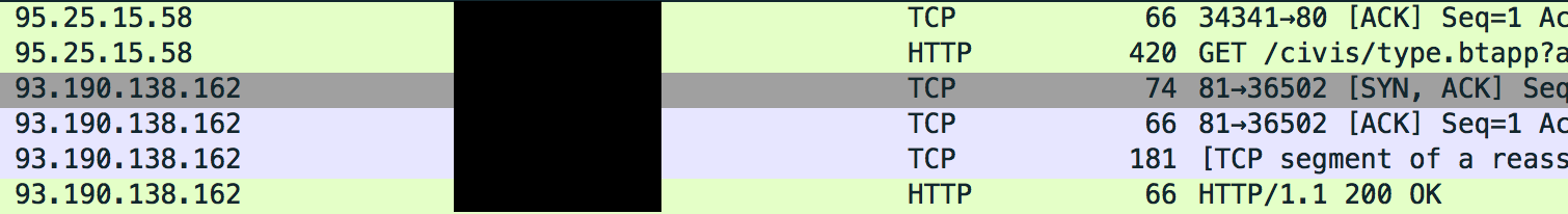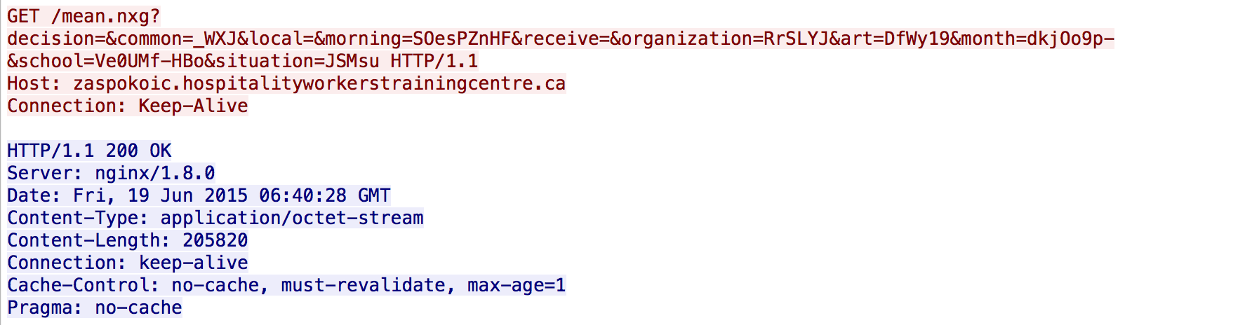 接続先のシステム、つまりエクスプロイト サーバが、実際のエクスプロイト キットを実行しているホストです。攻撃者がこのような動作を実装しているのには、いくつもの理由があります。第 1 に、この手法は構築が容易であり、nginx Web サーバを実行する基本的な Linux イメージを構築して真の侵害サーバに接続をプロキシするよう設定するのは、ごく簡単です。またこの手法は追加の防御層を構築することにもなり、プロキシ サーバが停止もしくは阻止されても、真のエクスプロイト キット サーバには影響が生じません。さらに、単一のエクスプロイト キット サーバから多数のプロキシ サーバに、システムを侵害するためのデータを配信することも可能です。次の図に示すとおり、Talos が入手したネットワーク キャプチャはこの動作を裏付けるもので、ユーザがランディング ページをリクエストした直後に、このプロキシ サーバへの接続が確立されてランディング ページが返され、次にそのランディング ページがユーザに提供されています。