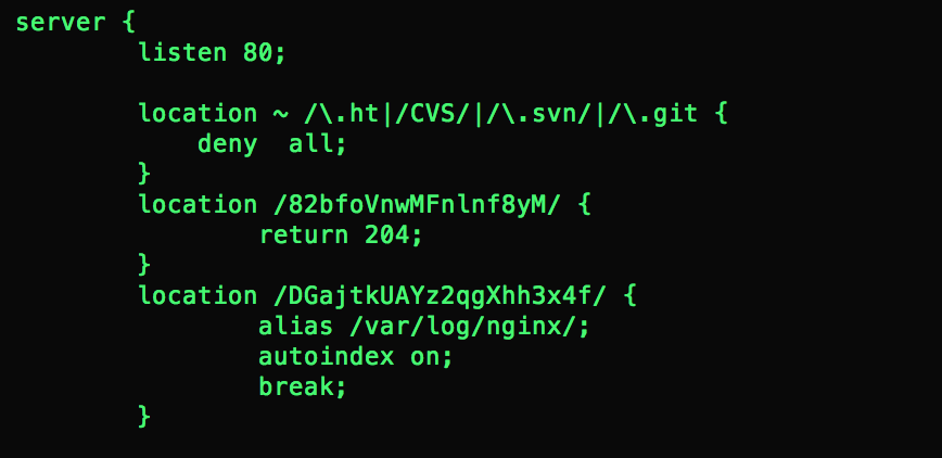 この動作は、プロキシ サーバとエクスプロイト サーバの間で繰り返されて、大量のネットワーク トラフィックが発生します。もう 1 つの注目すべき点は、ヘルス モニタリングが行われていることです。次に示すように、nginx サーバの設定ファイル内には、ヘルス モニタリングに関連する 2 つのセクションが含まれており、侵害されたユーザに関するデータを収集しています。