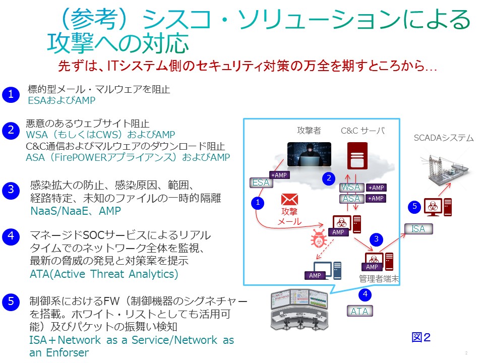 シスコには、制御系システムへの渡り対策として、制御系機器のシグネチャを搭載したファイアウォールIndustrial Security Appliance: ISA)があります。もちろん、機械的な対策とともに、USB メモリなどのリムーバブル メディアの利用禁止、あるいは運用上のルールといったものを徹底する必要もあります。
