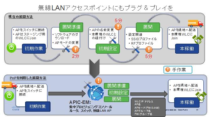 PnP 機能がなければ、アクセス ポイントを展開前にセットアップ用の WLC(ワイヤレス LAN コントローラ)、もしくは現地で本環境の WLC に接続して、アクセスポイントのモードを変更し、コードをアップグレードし、名前を付け、SSID や RF プロファイルを設定するといった初期設定が必要となります(現在の展開では、一般的な作業だと思います)。これらの設定展開作業が、APIC-EM と PnP 機能によって一括管理、展開されるため、AP ごとの初期設定作業が不要になります。