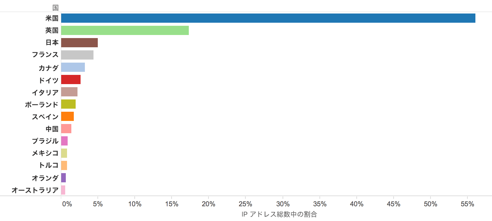によると、世界で英語およびスペイン語を母国語とする人の数は、それぞれ 5.52 % と 5.85 % で、ほぼ同じです。しかし、ドイツ語(1.39 %)は、英語とスペイン語を母国語とする人の 4 分の 1 で、フランス語(1.12 %)、イタリア語(0.90 %)、ポーランド語(0.61 %)を母国語とする人口も、他の言語に比べてかなり少ないと言えます。この情報に基づき、影響を受けた IP を起点にして、トラフィックがどこで発生したのかを特定することを始めました。
