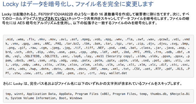 - http://www.bleepingcomputer.com/news/security/the-locky-ransomware-encrypts-local-files-and-unmapped-network-shares/ [英語]