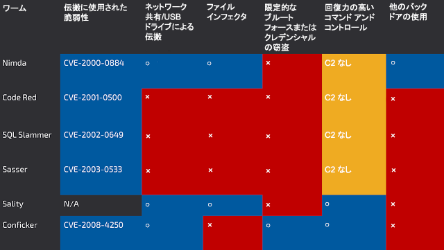 | 図 11:この表内の各ボットネットやワームは、永続的に増殖を続けるために活用できるさまざまなメカニズムを持っていたため、感染が速く、非常に復元性に優れていました。一部のボットネットは現在も健在です。 |