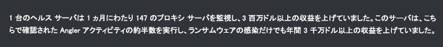 ランサムウェアは現在も世界中のユーザにとっての脅威となっています。この脅威はますます大胆になり、より大規模な標的と大きな見返りを追うようになっています。Angler エクスプロイト キットの動作方法の詳細を明らかにした Talos 独自の記事の推定によれば、ランサムウェア ペイロードの配布は、Angler EK オペレータにとって、年間 6,000 万ドルを稼ぎ出す一大産業です[17]。つまり 1 ヵ月あたり 500 万ドルを得られる計算になります。しかしこれは、1 セットのオペレータが 1 つのエクスプロイト キットを使用してランサムウェア ペイロードを 1 セット配布するだけで得られる利益に過ぎません。つまりランサムウェアは、サイバー犯罪者にとってビッグ ビジネスなのです。