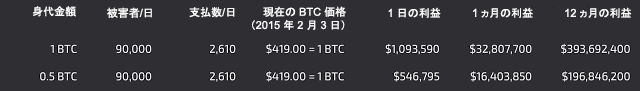 | 図 5:この表は、感染数が 1 日あたり 90,000 人、身代金を支払うのが被害者の 2.9 % と仮定した場合に Locky が取得する 1 日、30 日、1 年ごとの推定平均金額です。支払額は、0.5 および 1 BTC として計算されています。 |