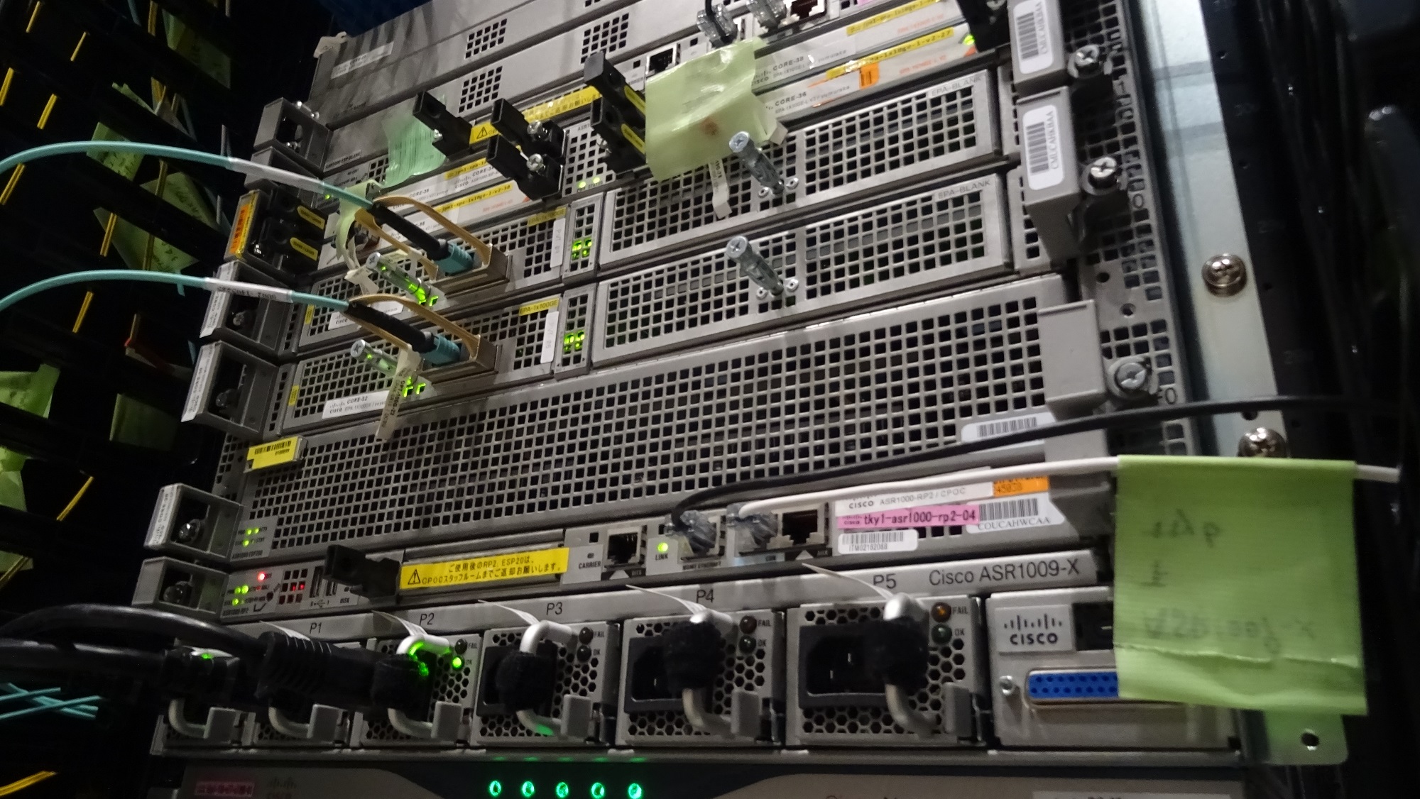 外接ルータとして動作しているのは Cisco ASR 9904。昨年に続いての登場です。6RU という小型ながら、 4×100Gラインカードを搭載し、サービス プロバイダーと 100Gbps で接続して BGP フルルートを収容します。さらに今年は、ラインカード上で様々な仮想サービスを動作させることのできる VSM(Virtual Service Module)を搭載しており、Arbor の DDoS 対策ソリューションが稼働中です。これにより、より効果的なネットワークエッジでの DDoS 対策が実現できています!