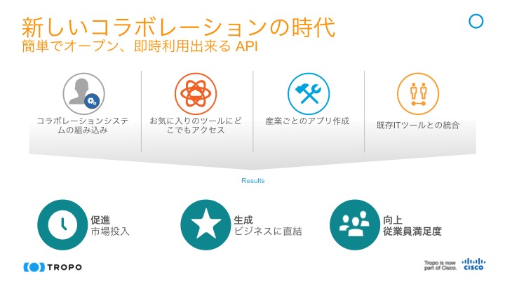 シスコのコラボレーション製品では、開発者向けのインターフェイス API によるイノベーションを促進しています。去る 6月27日には、開発者向けの API ハンズオン トレーニング イベント「Cisco Spark / Tropo API トレーニング 」を開催し、電話向けの API である Cisco Tropo と グループ コラボレーション ツールである Cisco Spark の API を紹介しました。実際に API に触れる機会となったこのイベントには、80名を超える参加者にお集まりいただきました。その内容をブログで紹介していきたいと思います。
