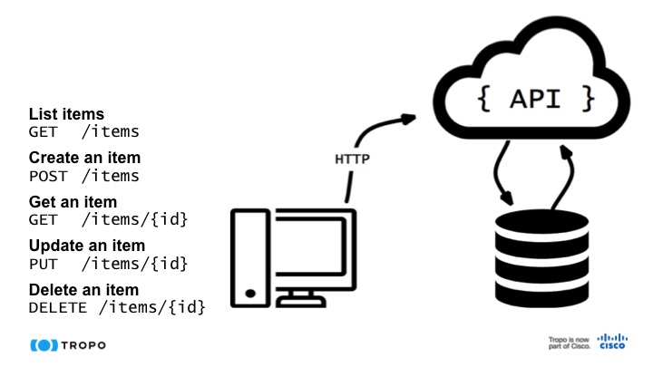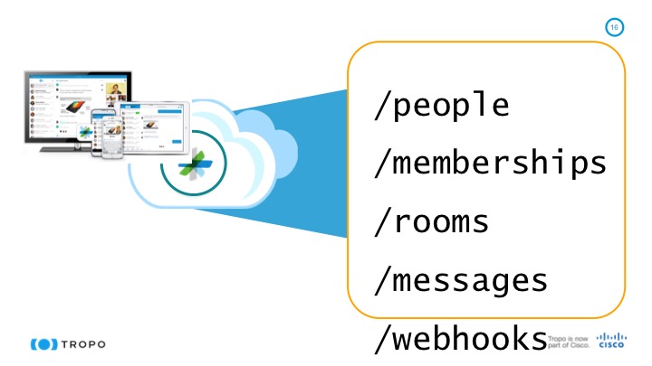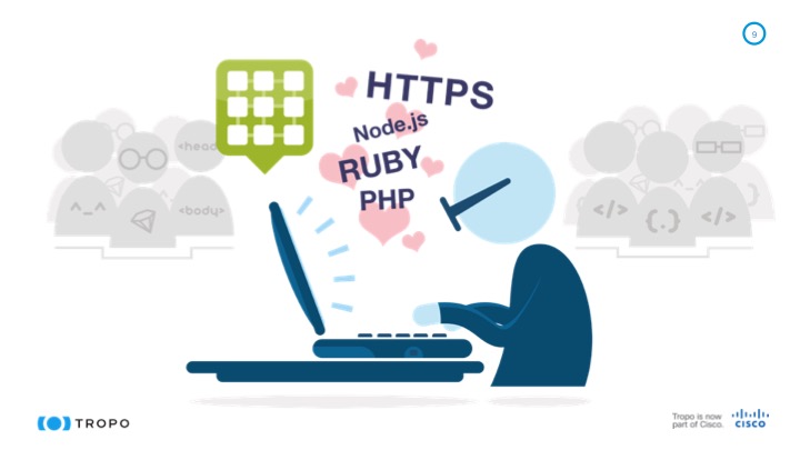 Cisco Spark/Tropo のAPI では、より簡単にアクセスできるように Web でよく使われる REST をベースに API を構築しています。 電話やコラボレーションツール専用の方法ではないため、 Web の開発者は簡単にコラボレーション API の世界に入ることができます。