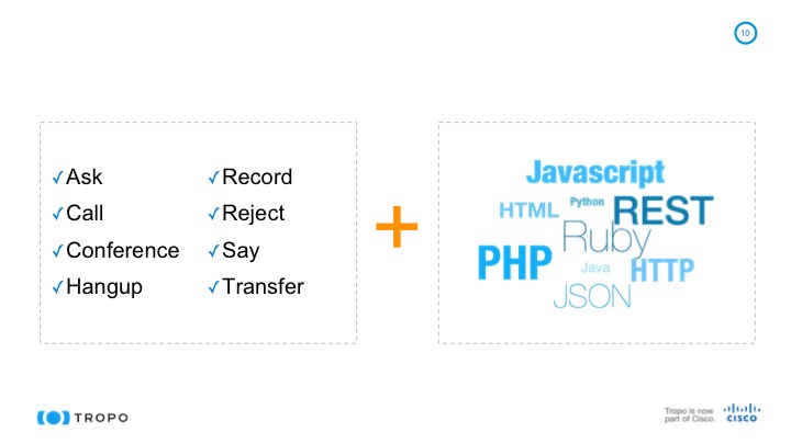 Cisco Tropo は電話の公衆網(公開されている電話番号)を使って、電話アプリケーションを実装できるプラットフォームです。Web の開発者は、使い慣れた HTTPS/Node.js/Ruby/PHP を使ってアプリケーションを開発できます。