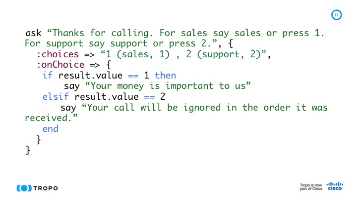 さらに電話の機能を実行するには 「Say」「Ask」などお馴染みの動詞で命令を書くことができます。