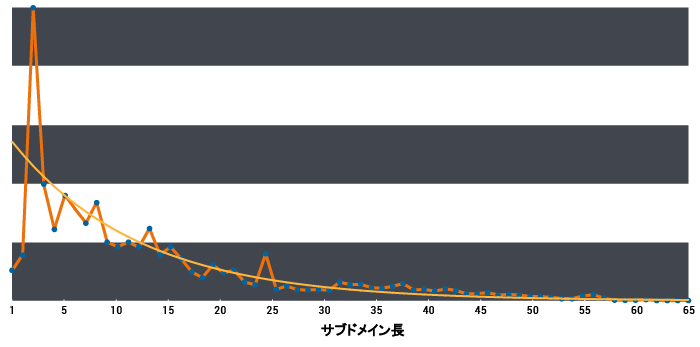 オレンジの線は、1 ~ 65 文字までのサブドメイン長の分布を示しています。明らかに完全には一致しませんが、この分布は、黄色で示されたなめらかな指数曲線にほぼ一致します。この指数曲線を正常性のモデルとして使用し、観察内容と比較すれば異常を検出することができます。