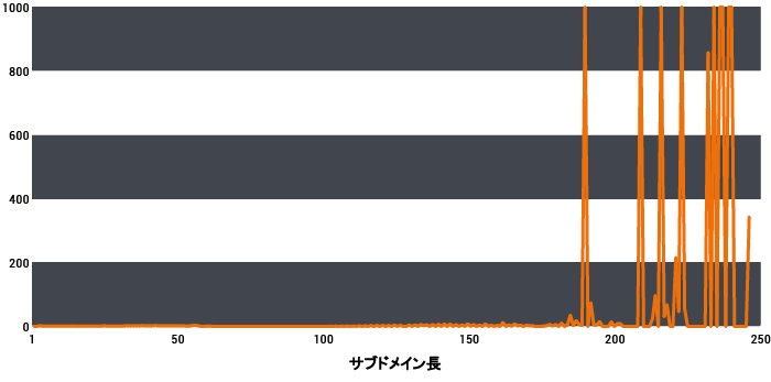 こうした異常な値に着目すれば、一連のログを手動で確認する手間を減らすことができます。これらの文字数の多いサブドメインは、正規のクラウドサービスや、コンテンツ配信ネットワークのものであることがわかっています。ただし、サブドメイン長が 231 文字と 233 文字のドメインの一部は、大いに興味を引きます。