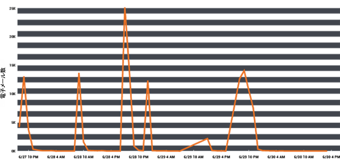 Talos は Zepto ランサムウェアの増加を確認し、その拡散方法がスパム メールであることを特定しました。Locky/Zepto は依然としてよく知られたランサムウェア タイプであるため、Talos はスパム メール キャンペーンを注視しています。直近の 4 日間で、137,731 通の電子メールで添付ファイルの命名規則が使用されていることがわかりました(この数が回文であることは全くの偶然です)。今回のスパム キャンペーンで使用されている名前は「swift [XXX|XXXX].js」であり、「X」は「swift」名に続く文字と数字の組み合わせで、長さ 3 文字または 4 文字が確認されています。このキャンペーンは、6 月 27 日月曜日に始まり、約 4,000 通の電子メールが Talos の電子メール セキュリティ アプライアンス(ESA)内でキャッチされました。この数はその後数日にわたって増加していき、特に午後 7 ~ 10 時(UTC)と午前 7 ~ 10 時(最初の 4 日間)には急激な増加が見られました。