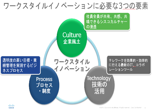 シスコでは、テレワークをはじめとした働き方改革を進めるためには、3つの要素((1) 組織風土 (2) プロセス・制度 (3) テクノロジー)が必要だと考えられています。重要なポイントは、単にテクノロジー(IT ツール)だけを導入するのではなく、社員が最大限に専門性を発揮し、ビジネスに貢献できるように、全員が共有、共感して共鳴できるシスコの企業風土を浸透させ、さらに、透明度の高い目標管理・業績管理を実現するビジネスプロセスを展開するという三要素について一体的に取り組むというところにあります。