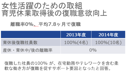 cisco-dispatched-04-teleworking-in-cisco-fig4シスコのテレワークの効果として特筆すべきことは、なんといっても「女性の育児休業取得後の復職意欲の向上」ではないでしょうか。シスコの社内アンケート調査によると、2013年・2014年ともに育休後復職率は 100% であることに加え、産休・育休中/後の離職率は 0%、平均 7.8ヶ月で復職と驚異的な数字が出ています。また、復職した社員の 100% が、「在宅勤務やテレワークを含む柔軟な働き方が復職を促すサポート要因となった」と回答しており、シスコの進める働き方改革が間違っていなかったということを社員自らが証明していると同時に、働きやすさの恩恵を社員がきちんと享受しているということが分かります。