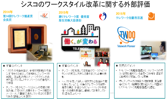 こういったテレワークをはじめとするシスコの働き方改革は、数多くの外部機関から評価されており、厚生労働省の「テレワーク推進企業等厚生労働大臣表彰」といった国の表彰も受賞する等、日本における働き方改革をリードしています。