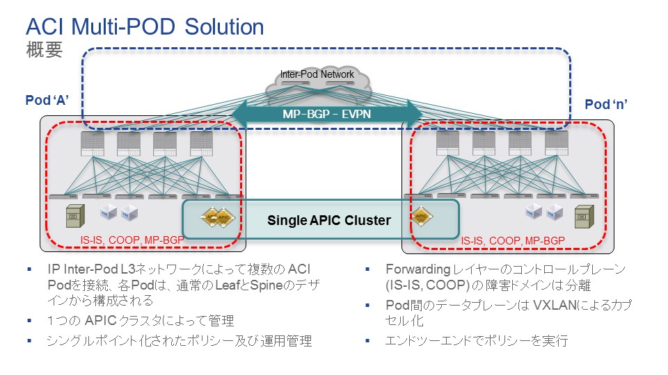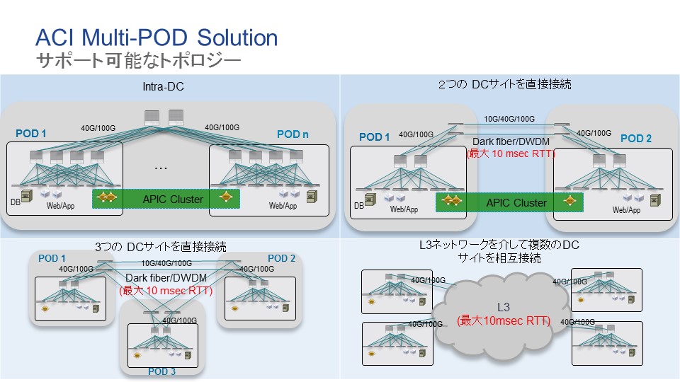 Multi-Pod は、ACI のコントローラである APIC(Cisco Application Policy Infrastructure Controller)を複数のデータセンターに分散配置して、3 台または 5 台の APIC で広域クラスタをサポートする機能です。これにより、ネットワーク管理者は、APIC コントローラーから複数の ACI ファブリック(複数のデータセンター)を集中管理しながら自在にポリシー制御することが可能となります。ネットワーク ポリシーの一貫性の維持も容易となるため、ACI の最大の特長であるホワイト リスト型ネットワークのメリットを最大限に活用することができ、Active/Active データセンターの実現可能性も高まります。