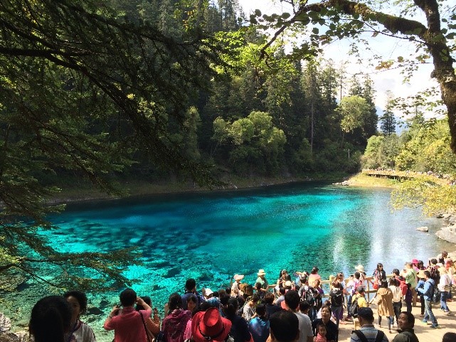 筆者は 2014年9月に九寨溝を旅行で行きました。その際に驚いたことが二つあります。一つ目は、場所によっては標高 4,000メートル近くの高地だというのに(富士山より高い!)、浦安のテーマパークのような入場ゲートが整備され、その先の道路も舗装されていて、山道どころかきれいに整備された遊歩道が延々と続いていること。サンダル履きで撮影ポイントにたどりついて記念撮影する観光客もいるほどです。