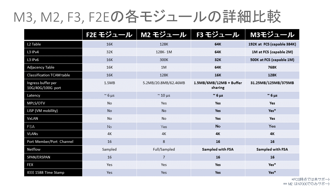 ラインカードには、10G、40G、100G のポート タイプ別にそれぞれ F3 モジュールと M3 モジュールが提供されており、合計 6 種類のラインカードから選択可能です。どのモジュールも、L3 ルーティング、OTV(Overlay Transport Virtualization)、FabricPath、VXLAN-EVPN、FEX(Fabric Extender)、MPLS、LISP(Locator/ID Separation Protocol)など、 分散仮想データセンターに必要とされる機能をサポートしています。では、F3 モジュールと M3 モジュールの違いは?ということになると、M3 モジュールの優れた拡張性にあります。M3 モジュールは、F3 モジュールと比較して大容量の MAC テーブル数(最大 384k エントリ)、ルートテーブル数(IPv4 最大 200 万ルート、IPv6 最大 100 万ルート)、ディープバッファ(375 MB per port)といったのハードウェア性能を備えており、よりデータセンターのコアスイッチとして最適化が図られているのです。詳細は以下の表を参照ください。