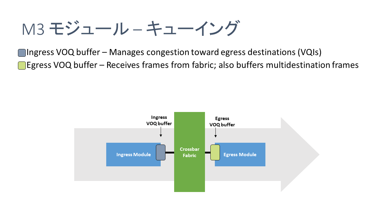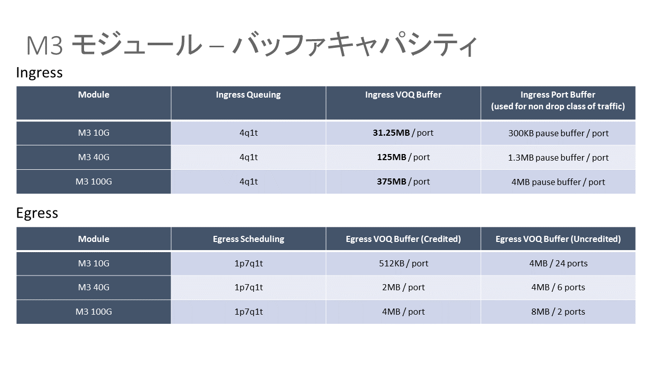 また、M3 モジュールでは、Ingress と Egress に別々のポート バッファを設けています。これにより、ユニキャスト トラフィックにて Congestion が発生した際には Ingress バッファを使用し、BUM トラフィックにて Congestion が発生した際には Egress バッファで管理することができるようになっています。コア スイッチとしては、データセンター内と WAN の速度差分を埋めるに十分なハードウェア設計となっています。