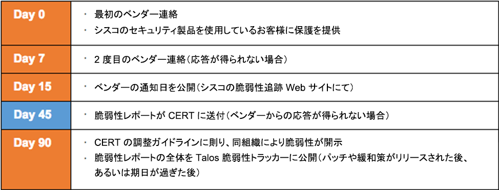 Talos では、90日の公開ウィンドウを反映するため、ポリシーのスケジュールを変更します。今回の変更は、ベンダーからのフィードバック、パッチ適用までの平均時間(Talos の脆弱性開発チームのデータに基づく)、そして一般インターネット ユーザの保護を向上させるのに最適な脆弱性開示期限といった、複数の要因に基づいています。次の図では、更新された情報開示ポリシーにおける主な手順の概要を説明します。タイムライン目標については、パッチ適用までの時間を十分に確保するため、ベンダーと随時調整する予定です。パッチ適用までの時間を短縮するよう促すため、タイムライン目標はケース バイ ケースで確認されます。何らかの脅威が発生した場合など、考慮すべき事情がある際は、開示ポリシーやタイムラインが前後で調整される可能性もあります。