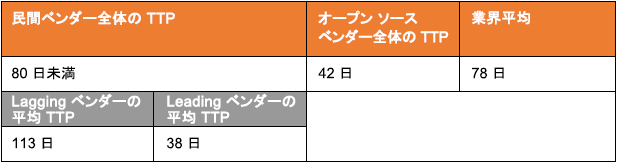 次に、各ベンダーのタイムラインとパッチ適用時間(TTP)に関する発見をご紹介します。ベンダー全体の平均パッチ適用時間は 78 日でした。一見すると、民間ベンダーは、オープン ソース ベンダーよりも対応が遅れる傾向にあります。ただし、さらに分析すると興味深い事実が明かになりました。