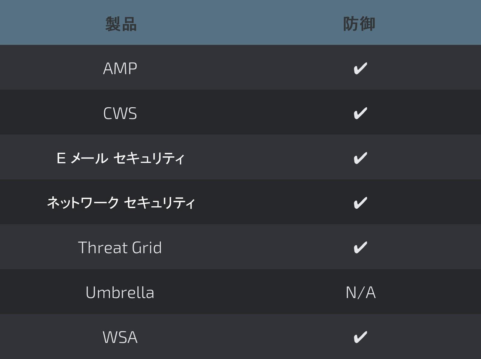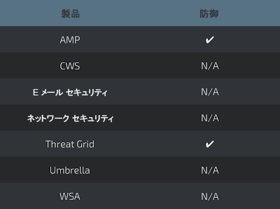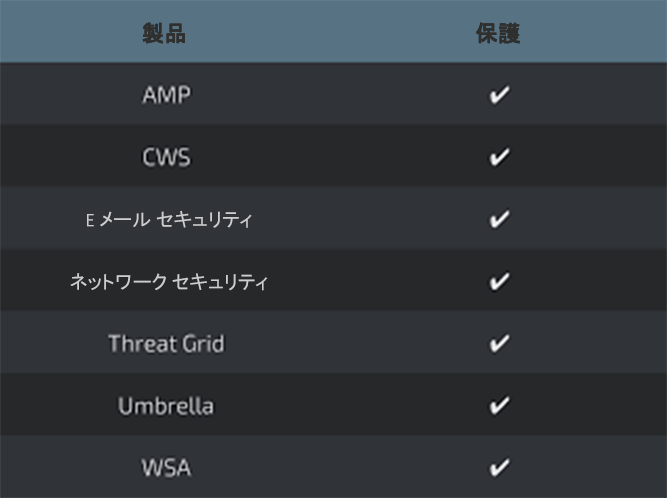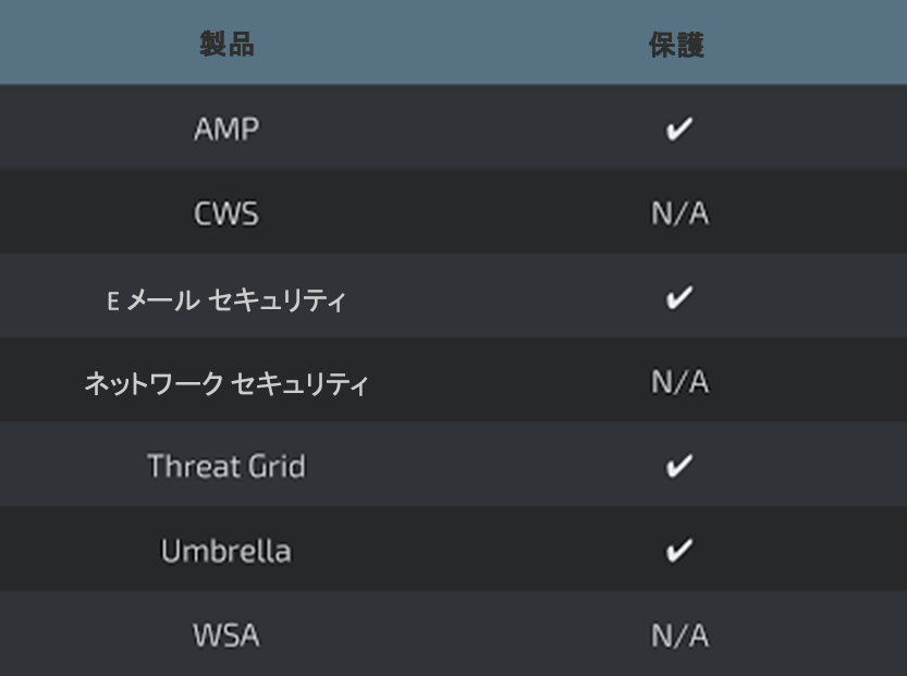 下記の脅威に関してここで記載する情報は、すべてを網羅しているわけではないこと、また公開日の時点では最新のものであることに留意してください。以下の脅威に対する検出とカバレッジは、今後の脅威または脆弱性分析により更新される場合があります。最新の情報については、FireSIGHT Management Center、Snort.org、または ClamAV.net を参照してください。