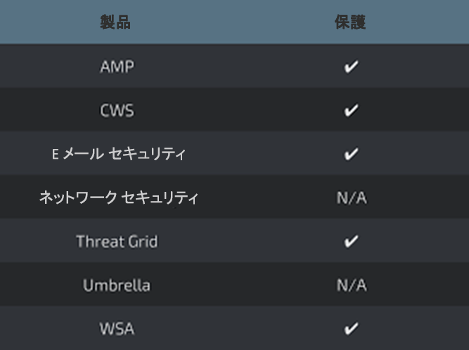 下記の脅威関連情報は、すべてを網羅しているわけではないこと、また公開日の時点に限り最新のものであることに留意してください。脅威に対する検出とカバレッジは、今後の脅威または脆弱性分析により更新される場合があります。最新の情報については、Firepower Management Center、Snort.org、または ClamAV.net を参照してください。