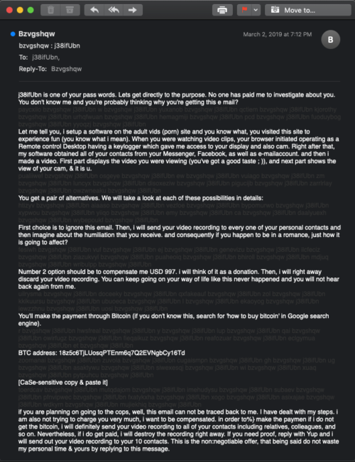 ユーザが過去に訪れたポルノ サイトに侵入したと攻撃者が主張しているからです。さらに攻撃者は、ユーザのデスクトップと Web カメラを乗っ取り、ユーザの姿と(ユーザが閲覧した)ポルノ コンテンツを録画したとも主張しています。