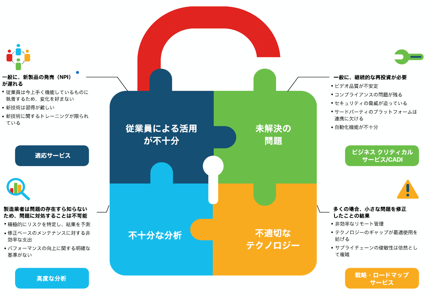 しかし実のところ、テクノロジーは完璧ではありません。コラボレーションの実装は困難であり、最終的な成果が当初の想定とかけ離れることも多くあります。ただし人間も完璧ではありません。多くの IT 部門は独自の実装を試みていますが、その複雑さゆえに絶えずテクニカル サポートに頼るなど、閉塞感すら生まれているのです。一方で、実装プロジェクトの遅延や人件費などによって追加費用も発生しています。シスコでも同じ技術を 15 年間も使い続けていた時代があるため、製造業界における不満は私たちもよく理解できます。そこで役立つのがシスコの専門技術です。コラボレーションの成功を加速させ、インダストリ 4.0 に向けた準備を阻む 4 つの大きな落とし穴を回避するなど、お客様の課題を解決するために貢献しています(図 1)。