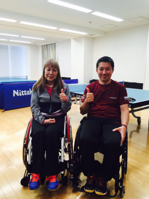 普段の練習は車椅子同士ではなく、健常者のコーチを中心に、大学生、高校生と打つことが多いのですが、この日は僕がホームとさせてもらっている T.T labo(江戸川区にある卓球場です)に、あの!別所キミヱさんが来てくれて、約 5 時間、一緒に練習しました。