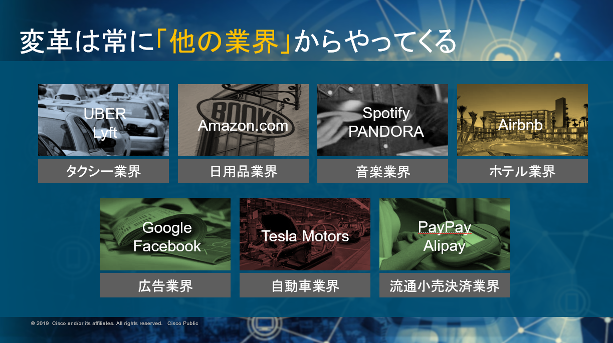 タクシー業界の UBER、ホテル業界の Airbnb などに代表される「ディスラプター」には、2つの共通した特徴があります。1つは裏側でネットワーク技術を最大限に駆使している、ということと、もう1つは既存の業界の外から登場し、一夜にして市場を席巻するスピード感です。5G は、一段とこのデジタル変革を加速する要素となるでしょう。