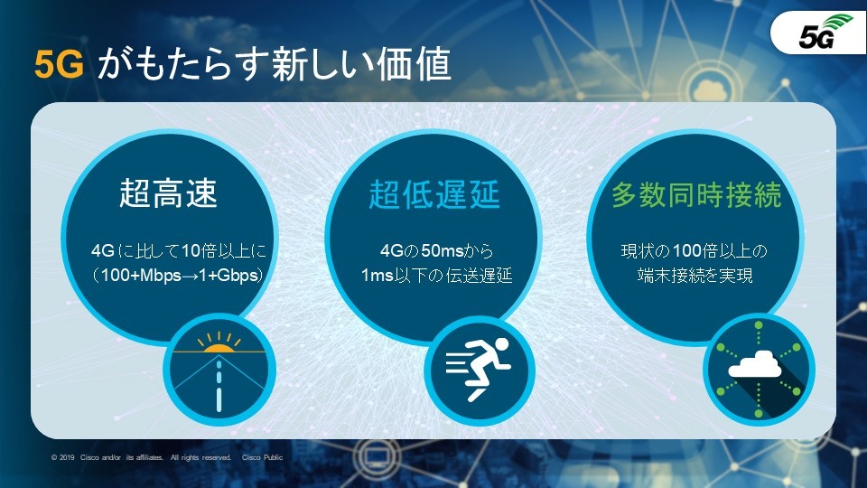 「超高速」、4G の 10倍以上の毎秒 1G通信。「超低遅延」、遅延はこれまでの 1/50 となり、従来のウィークポイントが解消されます。そして「多数同時接続」。人と人だけではなく、車両や機械同士の M2M、IoT のセンサー同士など、現状の 100倍以上の端末接続が実現します。