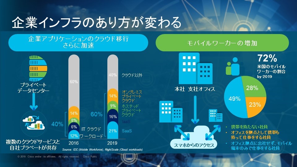 インフラはクラウド化し、社員は会社にいない。今後、企業のインフラが変化しないわけがありません。これまでの企業インフラは、本社、支店で完結する仕事でしたので、VPN を中心としたプライベートなネットワークが合理的でした。