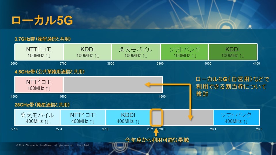 企業の 5G 利用を加速するもう 1 つの動きとしては、ローカル 5G があります。総務省が 2019年 4月、周波数の割り当てを決定しました。