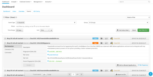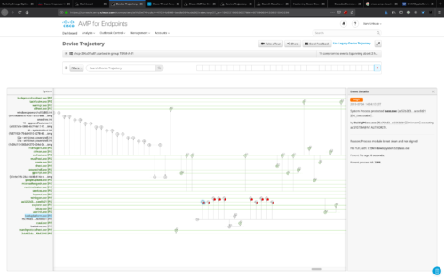 導入チームの端末に AMP Connector をインストールしていただき、AMP コンソール (管理画面) を眺めていると、この競技会のようにインターネットに繋がらないクローズドな環境においては、ハッシュ値によるマルウェア検知はなかなかヒットしません。しかしながら、AMP4E の強力な機能のひとつである、振る舞いでの検知を行う Cloud IOC や Exploit Prevention にて、例えば powershell.exe による動きを簡単に把握できました。