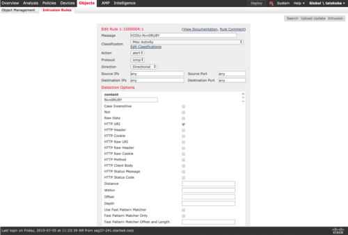 また、競技会の当日は、Firepower の管理ツールである Firepower Management Center (以下、FMC) で通信ログも取得できるように設定しておりましたが、その中で不明なユーザエージェントを通信ログに含まれているのを見つけたものの、デフォルトでシスコから提供されている IPS ルールでは、そのようなユーザエージェントは検知できないため、通信ログで見つけた情報を参考に、カスタムルールを作り、この通信を検知する機能を導入チームに提供することができました。