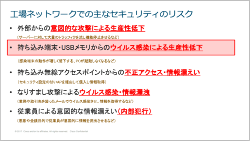 製造業における過去のセキュリティ事故を見ると、生産設備のメンテナンスに伴う USB メモリや管理用端末の接続、出入り業者の持ち込み端末が原因となるケースも多く、OT 側、特に生産設備ネットワークでのセキュリティ対策は IoT 推進には必須と言えます。