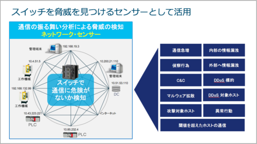 生産設備ネットワークのセキュリティ対策では「生産設備を絶対に止めない」ことが前提になります。このため、生産設備にアンチウイルス ソフトを適用できないなど、IT 側とは異なる要件に対応する必要があります。そこで有効なのが、生産設備を接続する「スイッチ」を「脅威をみつけるセンサー」として活用する方法です。