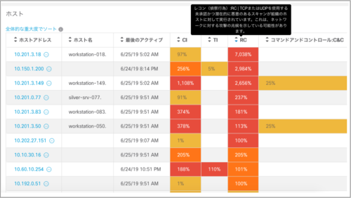 以下が Stealthwatch の画面例です。ネットワーク内の端末が一覧され、どの端末で過去1週間にどのような脅威が何%増加しているか表示されています。横軸が脅威の種類で、ポインタを当てると各脅威の説明がポップアップされます。この例ですと、端末 10.201.3.18 で RC(偵察行為)が 7,038% も1週間で増加しており、背景も赤くなっていて危険な端末であることがわかります。このように、危ない端末の有無が一目でわかります。