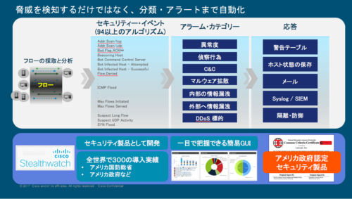 Stealthwatch では 94 種類以上のアルゴリズムを用いて脅威に関連する通信パターンを検知し、代表的な 11 種類の脅威に分類します。さらに、メール等で管理者に通知し当該端末を「隔離(ネットワークから切り離し)」することもできます。