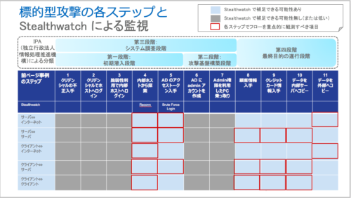 スイッチを脅威を見つけるセンサーとして活用する利点は「脅威の早期発見」ですが、Stealthwach で検知可能な脅威を IPA (独立行政法人情報処理推進機構)による標的型攻撃のステップに当てはめると、ステップ4、5といった「第一段階(初期潜入段階)」に該当します。実害が発生する前に脅威を見つけて取り除くことが可能で、「生産を止めない」という生産設備ネットワークの要件に適合します。また、生産設備に専用ソフトのインストールが不要な点も、同様に「生産を止めない」という要件に該当します。