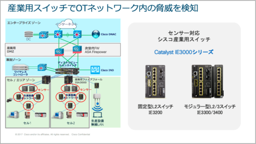 シスコ産業用スイッチ Catalyst IE3000 シリーズは、L2 アクセススイッチ、または、L3 ディストリビューション スイッチで 100%通信をモニター可能です。生産設備を収容する L2 アクセス スイッチをセンサー化することで、 IPA による標的型攻撃のステップの「第一段階(初期潜入段階)」で脅威を見つけることが可能となります。