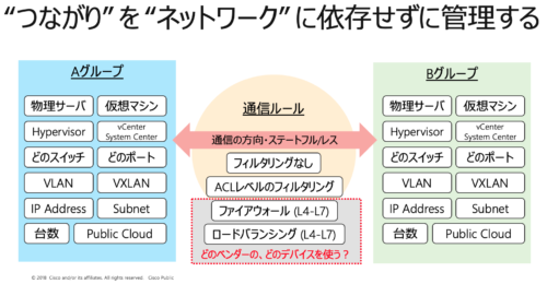 対して、アプリケーションのつながりを管理するためには、それらネットワークの世界には依存しない管理性が必要です。アプリケーションを構成する DB サーバに接続を必要とする Web サーバにとって、そして Web サーバに接続を行うユーザにとって、それらのサーバが「どのスイッチの、どのポートで、どの VLAN Tag をつけて、どの MAC アドレス、どの IP アドレスで通信する」のかは関係ありません。単純にユーザは Web サーバに、Web サーバは DB サーバに、必要な通信ルールに基づいて通信ができればいいだけです(同時に、セキュリティという意味ではユーザは DB に直接アクセスできないことも重要です)。サーバの実体が物理サーバなのか仮想マシンなのか、また 1台だけなのか 100台あるのか、それら「ネットワーク的なパラメータ」には依存しない、あくまでもアプリケーションとしての Web と DB、ユーザと Web といったつながりを適切に管理できる仕組みこそが必要なのであって、単に物理ネットワークの上に仮想スイッチ・仮想ルータ・仮想ファイアウォールなどを配置した「物理ネットワークに依存せずに通信を行うソフトウェアだけで構成されたネットワーク(=SDN?)」 が必要なわけではないはずです(それでは単に物理ネットワークと仮想ネットワークの 2つのネットワークを管理しなければならなくなるだけですし、アプリケーションの要件をネットワーク設計に落とし込む手間は、対象がそれら仮想デバイスに置き換えられたとしてもさほど変わりません)。
