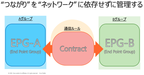 しかし実際には、ネットワークとしてのパラメータは現実の通信を成立させるためには必要となります。ACI は、従来の「ネットワークの世界」と、アプリケーションが必要とする「つながりの世界」を結びつける手段です。そのために必要だからこそ、Fabric Controller と SDN Controller の両方を融合させた幅広い範囲を管理対象としています。アプリケーションを構成するサーバが物理から仮想へ、そしてコンテナへと変化したとしても、ACI においてはアプリケーションとしての接続要件(WebサーバからDBサーバへ特定の通信プロトコルで通信することを許可する、等)が変わらない限り同じ構成のままで管理することが可能です。アプリケーションを構成する要素であるEndpoint が複数のスイッチに分散して配置されていたとしても、Endpoint の台数が 10台から 1000台に増えたとしても、ACI における論理的な接続性の管理においては一切複雑性が増すことはありません。