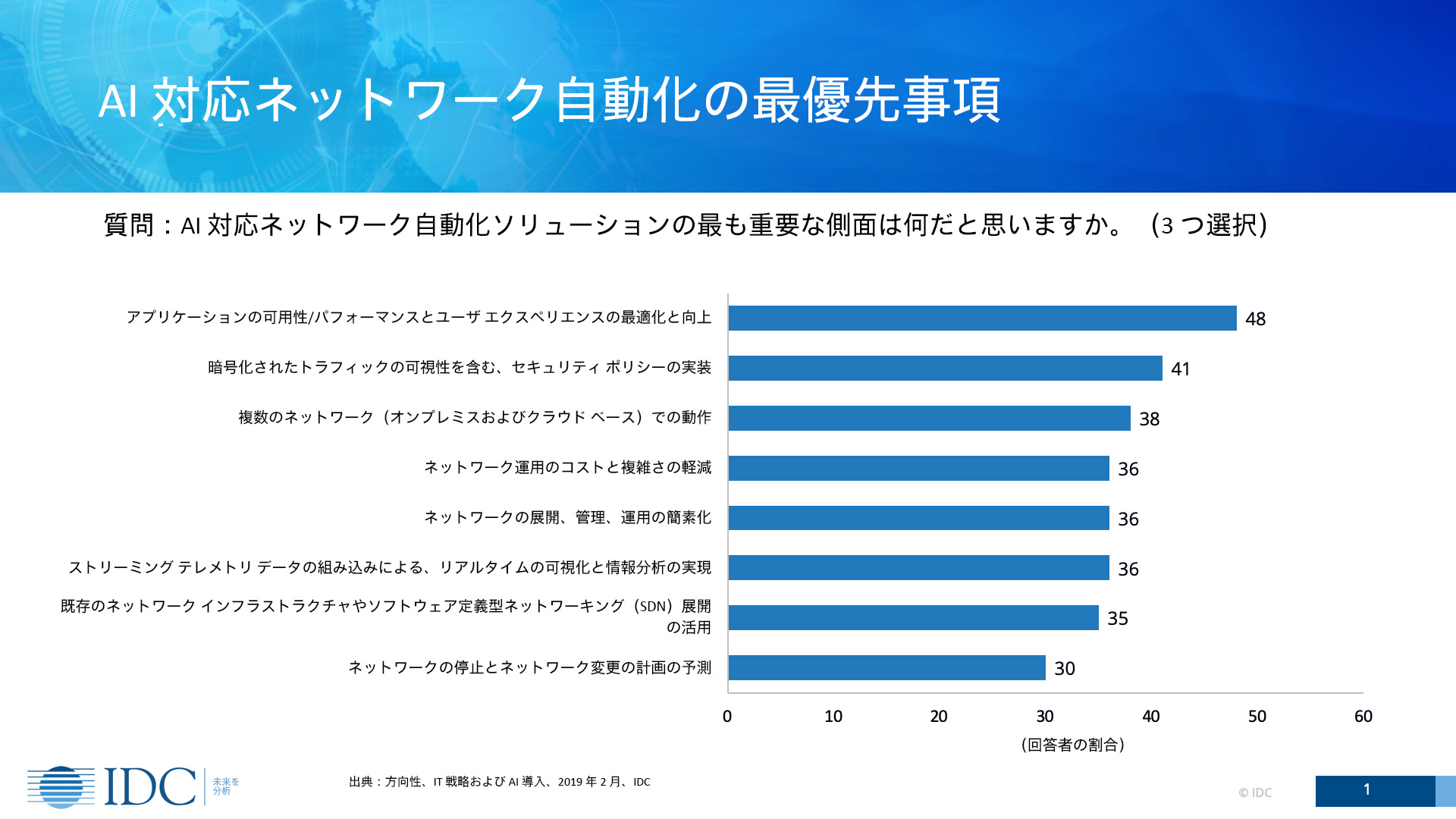 クラウド時代に突入した現在、企業は AI を利用したネットワーク自動化の導入に大きな価値を見い出しています。今年初めに IDC が実施した IT 戦略と AI 導入に関する調査では、AI を利用したネットワーク自動化ソリューションの最も重要な側面の 1 つとして「アプリケーションの可用性/パフォーマンスとユーザ エクスペリエンスの最適化と向上」が挙げられました。また、「暗号化されたトラフィックの可視化を含む、セキュリティ ポリシーの実装」という意見も多数ありました。その他に、考慮する機能として多く挙がったものには、「複数のネットワーク(オンプレミスとクラウド ベース)での動作」があります。そして「ネットワーク運用のコストと複雑さの軽減」および「ネットワークの展開、管理、運用の簡素化」と続きました。また、「ストリーミング テレメトリの組み込みによる、リアルタイムの可視化と情報分析の実現」も、同数の票を集めました(下図 参照)。