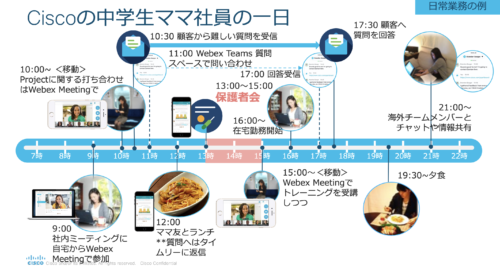 そしてその制度とそれを認め合う社内文化はシスコのカルチャーとして定着しており、働くママだけでなく、例えば 20代の独身男性が業務の効率化を求めて在宅をすることが選択できていました。それは業務についての効率が上がると各自が判断してのことで、育児や介護に関する理由をつける必要がないのです。そのため、いちいち『すみません』という必要はありませんでした。在宅やリモートの方が効率が上がると判断しての選択ですから。