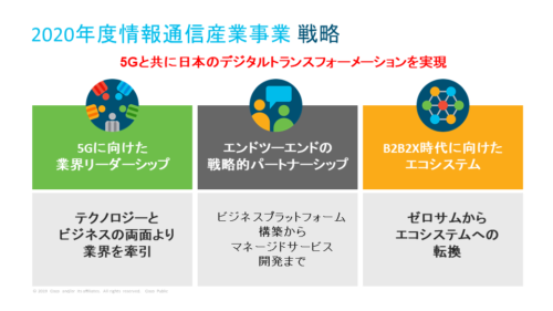 2019 年度のシスコジャパンは、主要通信事業者様をはじめお客様の多大なご支援とご愛顧により、二桁成長の大躍進を成し遂げることができました。2020 年度もこの勢いを継続すべく、いよいよ始まる 5G 時代に向けて、「5G と共に日本のデジタルトランスフォーメーション(DX)を実現する」というビジョンを掲げ、3 つの戦略を推進してまいります。